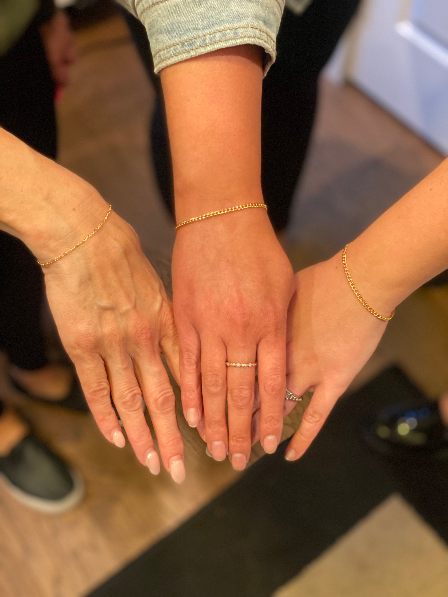 Permanent Jewelry is a fun bonding experience often enjoyed by friends and family. These pieces are designed by you. Select your chain, select your charm, and we weld it close to be worn as long as you'd like. We carry 14k gold , 14k gold filled, sterling silver and enamel chains and charms. We offer every letter in the alphabet and all of the birthstones to take your customization and personalization one step further. Message us to book your private event or for individuals and small groups schedule below.